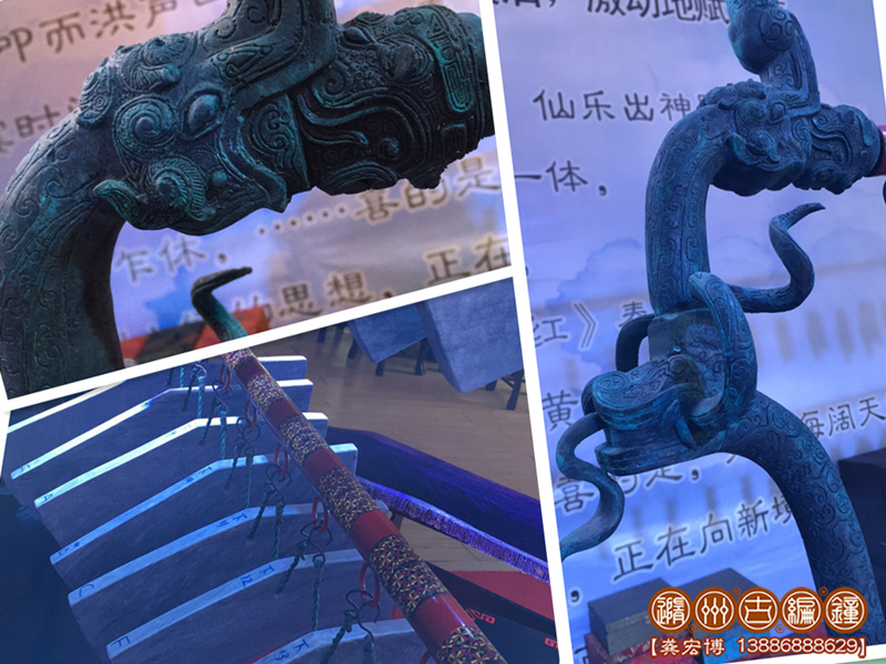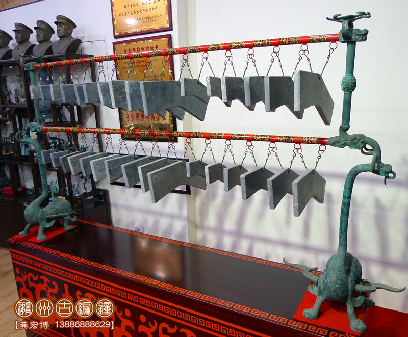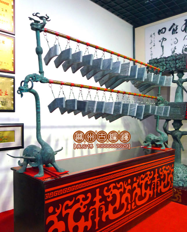 公司復(fù)原制作的32件曾侯乙編磬與原文物一致,編磬全長2.23米,寬50厘米,高1.08米;為了演奏方便,公司設(shè)計(jì)了編磬木桌承托編磬,長2.4米,高70厘米,寬45厘米,陳列編磬后總高度:1.78米。木桌內(nèi)做儲藏柜,可方便樂隊(duì)保管其他樂器及服裝,方便實(shí)用。