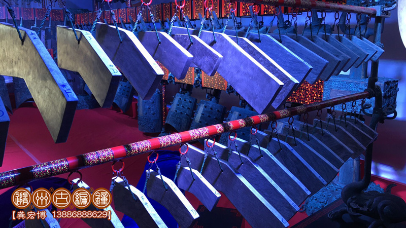 隨州市古編鐘文化發(fā)展有限公司通過考證歷史資料進(jìn)行研究分析,并八方尋找石源,終于將這套2400多年前的戰(zhàn)國初期大型編磬復(fù)制出來,其發(fā)音與原編磬的標(biāo)音銘文相符,低音渾厚洪高,高音明澈,音色優(yōu)美而動聽,音域達(dá)三個八度,可以旋宮轉(zhuǎn)調(diào),演奏多種樂曲。