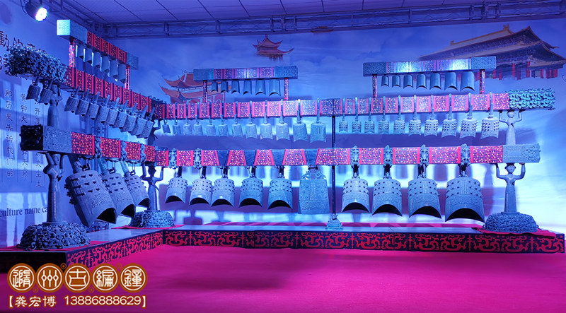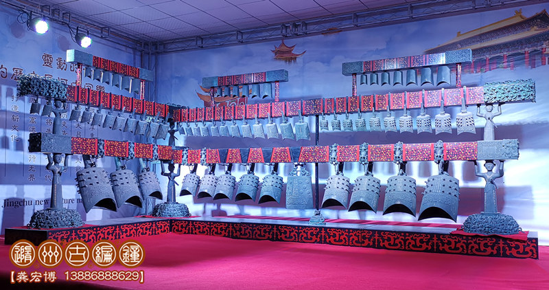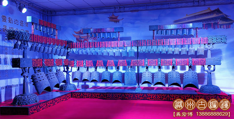技術標準:鑄件要求紋飾清晰,表面光潔,無裂、刺、孔、糙等鑄造缺陷;整套編鐘音域5個八度,一鐘雙音,按國際標準A=440Hz調音,音準控制在±5Hz內,音色統(tǒng)一協(xié)調,無雜、啞音響。其中下層13件為倍低音甬鐘,在演奏中起到烘托氣氛的作用,中層33件為中音域甬鐘,十二半音齊備,主要用于演奏主旋律,上層19件為被高音鐘和補音鐘,也是重要的半音和補充被高音音域,3組設計可以用于演奏復試旋律。其結構、配件、銘文等全部按照曾侯乙編鐘樣式仿制。